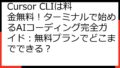- 無料プランの利用: Cursor CLIは、無料プランを提供しており、基本的な機能を、無料で利用することができます。