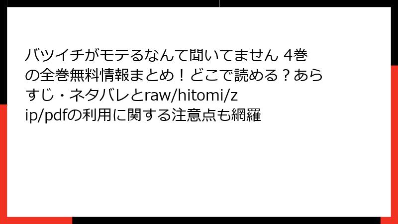こんにちは、漫画愛好家の皆さん! 人気の年の差ラブコメ『バツイチがモテるなんて聞いてません』を、raw、hitomi、zip、pdf、漫画バンクなどの海賊版サイトで無料で読もうかと迷っていませんか? 確かに、最新巻を待たずに一気読みできる魅力は大きいですが、そんな「タダ飯」に潜むリスクは想像以上です。この記事では、海賊版サイトの利用がもたらす法的・セキュリティ・倫理的な危険を、詳しく掘り下げてお伝えします。ブログ形式で読みやすくまとめましたので、未読の方も「これを読んで正規ルートを選ぼう!」と思えるはず。ネタバレなしでリスクに焦点を当てますよ。それでは、さっそく本題へ!