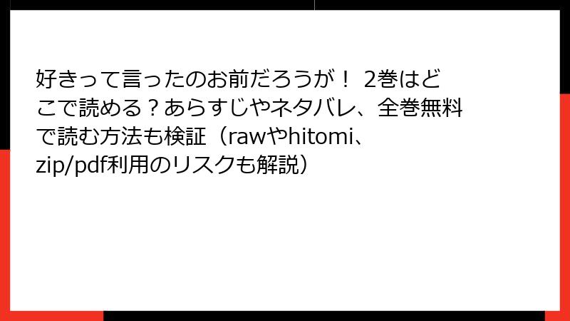 こんにちは、BL漫画ファンでセキュリティ意識の高いブロガーです! 人気の梅田みそ先生作『好きって言ったのお前だろうが!』は、甘くてコミカルな恋人生活が魅力の作品ですが、raw、hitomi、zip、pdf、漫画バンクなどの海賊版サイトで無料で読もうとする人が後を絶ちません。でも、そんなサイトを利用するのは非常に危険! 今回は、このような海賊版サイトのリスクを、法律面からセキュリティ面、倫理面まで詳しく解説します。ネタバレなしで読み進めつつ、なぜ正規ルートで楽しむべきかを徹底的に掘り下げます。未読の方も安心して読んでくださいね。海賊版は絶対NGですよ!