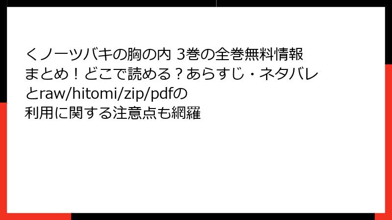 こんにちは、漫画ファンの皆さん! 人気作品『くノ一ツバキの胸の内』を無料で読みたい気持ちはわかりますが、raw、hitomi、zip、pdf、漫画バンクなどの海賊版サイトを利用するのは非常に危険です。このブログ記事では、そんな海賊版サイトで漫画を読むリスクを詳しく解説します。法的問題からセキュリティの脅威、経済・倫理的な影響まで、複数のセクションに分けて読み応えのある内容にまとめました。データや事例を基に、箇条書きやテーブルを使ってわかりやすくお伝えします。海賊版サイトは一時的な快楽を提供するように見えますが、長期的な被害が大きいので、絶対に避けましょう。代わりに正規の電子書籍サービスをおすすめします。それでは、詳しく見ていきましょう!