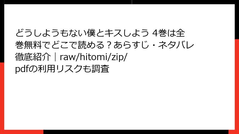 raw/hitomi/zip/pdf/漫画バンクなどの海賊版サイトは、法的罰則、ウイルス感染、プライバシー侵害、金銭損失、倫理的問題の塊です。無料の魅力に惑わされず、正規の電子書籍サービス(例: 公式アプリや書店)を利用しましょう。初回無料キャンペーンも多く、結果的にコスパも良いんです。『どうしようもない僕とキスしよう』を合法的に読み、作者を応援する喜びを実感してください!