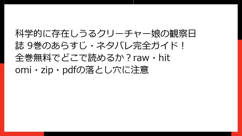 raw/hitomi/zip/pdf/漫画バンクなどの海賊版サイトは、法的罰則、ウイルス感染、倫理的問題のトリプルパンチで、利用する価値はありません。無料で読みたいなら、正規の電子書籍サービス(例: 無料試し読みやキャンペーン活用)がおすすめ。『科学的に存在しうるクリーチャー娘の観察日誌』も、公式アプリやサイトで安心して楽しめます。リスクを避け、クリエイターを応援する読書習慣を身につけましょう! 皆さんの安全な漫画ライフを祈っています。何か質問があれば、コメントくださいね。