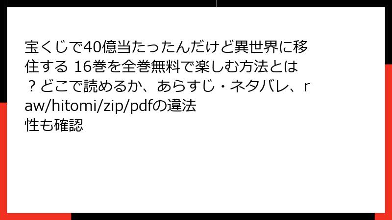 『宝くじで40億当たったんだけど異世界に移住する』は、すずの木くろ原作、今井ムジイ作画による人気の異世界ファンタジーコミック。16巻では、ジルコニアの救出作戦や戦争の足音が響く展開が話題ですが、こうした人気作品を「raw」「hitomi」「zip」「pdf」「漫画バンク」といった海賊版サイトで読もうとする人もいるかもしれません。しかし、海賊版サイトの利用には重大なリスクが伴います。この記事では、ブログ形式で、海賊版サイトで漫画を読むことの危険性を詳細に解説します。法的問題からセキュリティリスクまで、ネタバレなしで、読み応えのある内容をお届けします。海賊版サイトの利用を検討している方は、ぜひ最後まで読んで、リスクを理解してください。