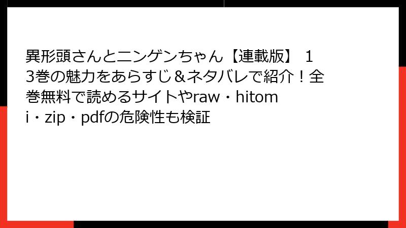 こんにちは、マンガファンの皆さん! 今回は『異形頭さんとニンゲンちゃん【連載版】』の13巻について、がっつりネタバレありでその内容を深掘りします。三毛たま先生によるこの異世界ラブコメディは、異形頭のラズと人間のちかちゃんの禁断の恋が織りなすドラマが魅力。13巻では、種族の壁や新たなライバルの登場により、物語が急展開! 以下、ネタバレ全開で主要なイベントやキャラクターの動きを解説します。未読の方はご注意を! 読み終えた方は、ぜひ一緒に興奮を共有しましょう!