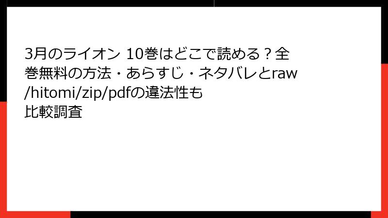 『3月のライオン』は、羽海野チカによる感動的なストーリーと繊細なアートで多くのファンを魅了する名作漫画です。しかし、raw、hitomi、zip、pdf、漫画バンクなどの海賊版サイトでこの作品を読むことは、重大なリスクを伴います。無料で手軽に読めるように見えるこれらのサイトですが、法的問題からセキュリティの脅威、さらにはクリエイターへの影響まで、多くの危険が潜んでいます。この記事では、海賊版サイトを利用することの具体的なリスクを詳細に解説し、なぜ正規の方法で漫画を楽しむべきかを明らかにします。