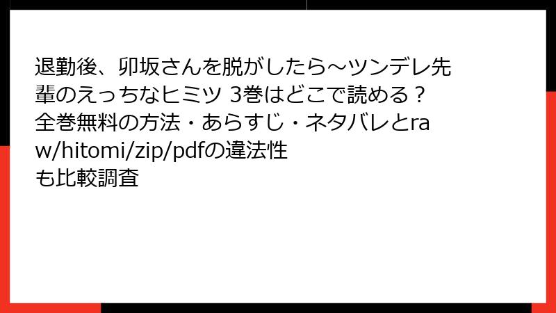 raw/hitomi/zip/pdf/漫画バンクなどの海賊版サイトは、法的罰則、セキュリティ脅威、経済・倫理的損失のトリプルパンチ。無料の誘惑に負けず、正規サービスを選べば、クリエイターを応援しつつ、安全に楽しめます。退勤後、卯坂さんを脱がしたらの甘い世界を、心置きなく堪能するために、今日から合法ルートへシフトを! 皆さんの体験談やおすすめサービスをコメントでシェアしてくださいね。次回の漫画レビューもお楽しみに!