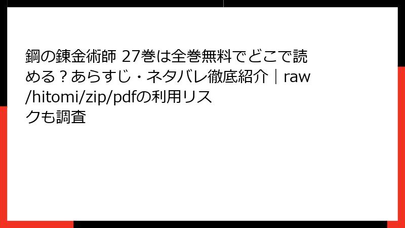 こんにちは、漫画愛好家の皆さん! 荒川弘先生の名作『鋼の錬金術師』は、兄弟の絆と錬金術の哲学が織りなす感動の物語で、世界中のファンを魅了していますよね。でも、最新巻やバックナンバーを無料で読みたい一心で、raw、hitomi、zip、pdf、漫画バンクなどの海賊版サイトに手を出していませんか? 今回は、そんな海賊版サイトを利用するリスクを徹底的に掘り下げてみます。法的トラブルからサイバー攻撃まで、意外と知られていない危険がいっぱいです。ブログ形式で、複数の