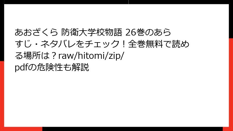 『あおざくら 防衛大学校物語』は、防衛大学校を舞台にした熱い青春ストーリーで、ファンの心を掴む人気漫画です。しかし、この素晴らしい作品を、raw、hitomi、zip、pdf、漫画バンクなどの海賊版サイトで読もうと考える人もいるかもしれません。確かに「無料」で読めるのは魅力的ですが、海賊版サイトの利用には重大なリスクが伴います。この記事では、ブログ形式でその危険性を詳しく解説します。単一の
