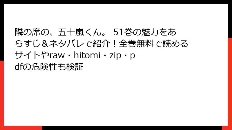 こんにちは、漫画愛好家のブロガーです! 『隣の席の、五十嵐くん。』は、瞳ちごさんによる心温まる少女漫画で、椿と五十嵐の恋物語に多くのファンが夢中になっています。しかし、この人気作品をraw、hitomi、zip、pdf、漫画バンクなどの海賊版サイトで読もうと考える人もいるかもしれません。今回は、そうした海賊版サイトを利用することのリスクを、詳しく解説します。違法サイトの利用は、個人だけでなく漫画業界全体に深刻な影響を及ぼします。この記事では、法的、技術的、倫理的な観点から、読み応えのある内容でその危険性を紐解いていきます。さっそく、見ていきましょう!