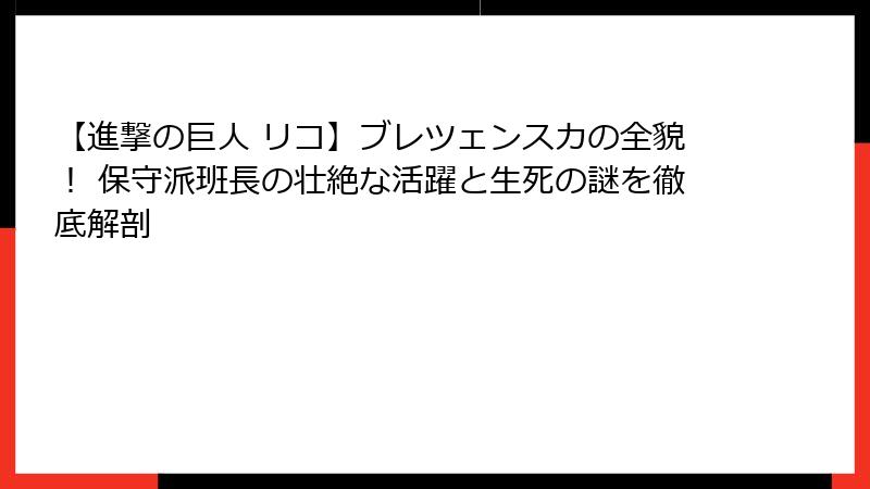 このブログ記事は、進撃の巨人 リコ・ブレツェンスカの魅力を余すことなく伝えるために、プロフィール、活躍、考察、ファン視点の4つの柱で構成されています。