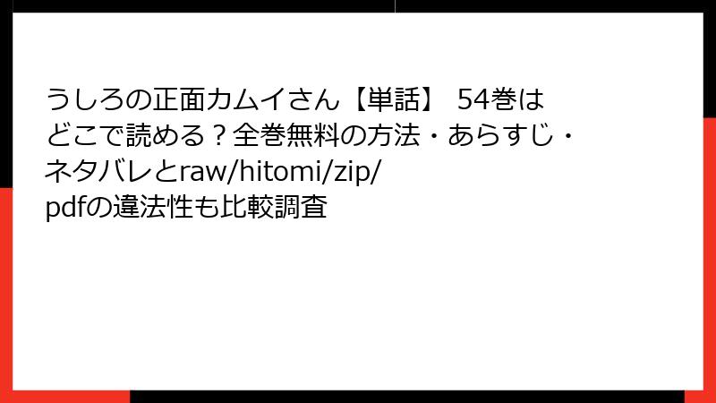 こんにちは、漫画ファン必見のセキュリティブロガーです! 人気エロコメディホラー漫画『うしろの正面カムイさん』のような作品を無料で読みたい気持ちはわかりますが、raw、hitomi、zip、pdf、漫画バンクなどの海賊版サイトに手を出していませんか? これらのサイトは一見お得に見えますが、実は法的な罰則から個人情報漏洩、デバイス破壊まで、想像以上のリスクが潜んでいます。2025年現在、著作権侵害の取り締まりが強化され、被害報告も急増中。この記事では、そんな海賊版サイトのリスクを多角的に深掘り。安全な代替策も提案します。あなたの読書ライフを守るため、ぜひ最後までお読みください!