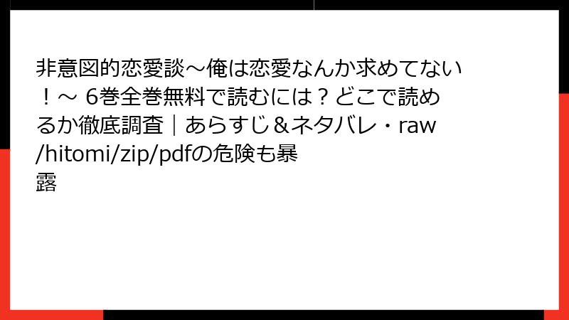 こんにちは、漫画ファンの皆さん! 特にBL漫画の名作非意図的恋愛談~俺は恋愛なんか求めてない!~にハマっている方なら、6巻の感動的な完結編を早く読みたい気持ちでいっぱいですよね。でも、「raw」「hitomi」「zip」「pdf」「漫画バンク」といった海賊版サイトでこの作品を読むことは、実は大きなリスクを伴います。この記事では、海賊版サイトを利用することの危険性を、法律、倫理、技術的な観点から詳しく解説します。単なる「違法だからダメ」だけでなく、具体的な問題点を掘り下げ、なぜ正規ルートで楽しむべきかを説明します。読み応えのある内容で、皆さんの安全な漫画ライフを応援します!