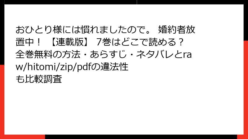 こんにちは、漫画好きの皆さん! 今日の記事では、人気ファンタジー・ラブコメ『おひとり様には慣れましたので。 婚約者放置中! 【連載版】』のような作品を、raw、hitomi、zip、pdf、漫画バンクなどの海賊版サイトで読むことのリスクを、詳しく掘り下げます。これらのサイトは無料で手軽にアクセスできる魅力がありますが、裏側に潜む深刻な危険があなたを待ち受けています。法的問題からサイバーセキュリティの脅威、さらには業界全体への影響まで、ネタバレなしで読み応えのある内容でお届け。安全に漫画を楽しむためのヒントも最後にまとめますので、ぜひ最後までお付き合いください!