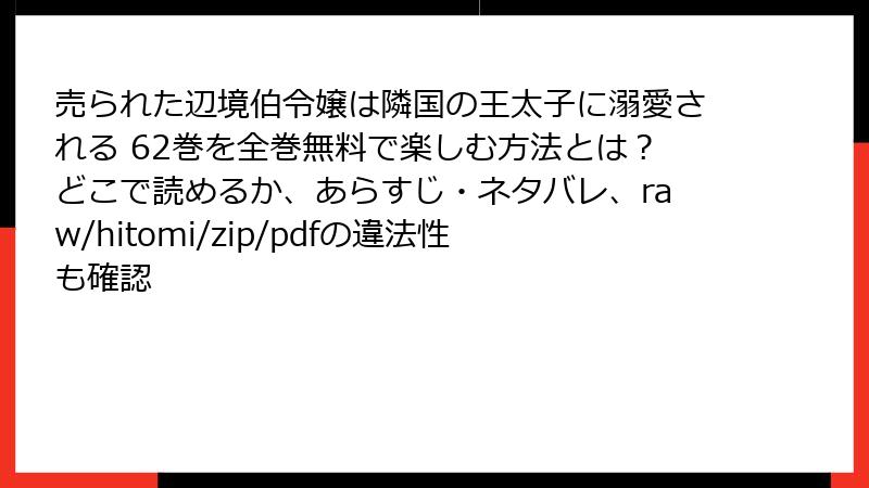 こんにちは、マンガ好きの皆さん! 人気のファンタジーロマンス売られた辺境伯令嬢は隣国の王太子に溺愛されるのような作品を、無料で手軽に読みたい気持ちはわかります。でも、raw、hitomi、zip、pdf、漫画バンクなどの海賊版サイトに手を出すのは、甘い誘惑の裏に潜むリスクが多すぎます。2025年現在、これらのサイトはドメイン変更を繰り返して生き残っていますが、利用者の被害報告が急増中。法的罰則からウイルス感染、個人情報漏洩まで、日常を脅かす危険がいっぱいです。このブログでは、そんなリスクを多角的に深掘り。テーブルやリストを使ってわかりやすく解説します。海賊版に頼らず、安全に楽しむためのヒントもお届け! まだ未読の方は、ネタバレ注意でお読みくださいね。