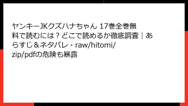 こんにちは、漫画愛好家のヤマトです! 『ヤンキーJKクズハナちゃん』は、宗我部としのり先生によるハーレムラブコメの傑作で、ヤンキーJKたちとのドキドキな学園生活が魅力の大人気コミックです。しかし、raw、hitomi、zip、pdf、漫画バンクなどの海賊版サイトでこの作品を読むことを考えている方もいるかもしれません。無料で読めるからと安易に手を出すと、思わぬリスクに直面する可能性があります。この記事では、海賊版サイトを利用する危険性を法的な問題からセキュリティ面まで詳しく解説します。『ヤンキーJKクズハナちゃん』を安全に楽しむためにも、ぜひ最後まで読んでください!