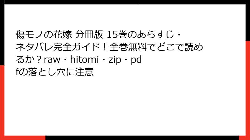 こんにちは、漫画ファンの皆さん! 『傷モノの花嫁 分冊版』は、友麻碧さん原作、藤丸豆ノ介さん作画による大人気の異世界ファンタジー漫画で、その魅力にハマる読者が急増中です。しかし、無料で読めるからといって、raw、hitomi、zip、pdf、漫画バンクなどの海賊版サイトを利用するのは絶対にNG! なぜなら、これらのサイトには重大なリスクが潜んでいるからです。この記事では、海賊版サイトで『傷モノの花嫁』を読むことの危険性を、法的、技術的、倫理的な観点から詳しく解説します。読み応えのある内容で、皆さんが正規の方法で漫画を楽しむきっかけになれば幸いです!