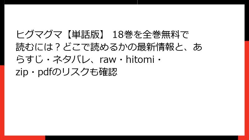 『ヒグマグマ【単話版】』は、奥谷通教によるホラーサスペンス漫画で、知床を舞台にした巨大ヒグマとの戦いが描かれる人気作です。しかし、このような人気漫画をraw、hitomi、zip、pdf、漫画バンクなどの海賊版サイトで読むことは、重大なリスクを伴います。無料で手軽に読める誘惑がある一方で、法的、倫理的、技術的な問題が潜んでいます。本記事では、これらのリスクを詳細に解説し、なぜ正規の方法で漫画を楽しむべきかをブログ記事形式で説明します。以下、複数の観点からリスクを掘り下げます。
