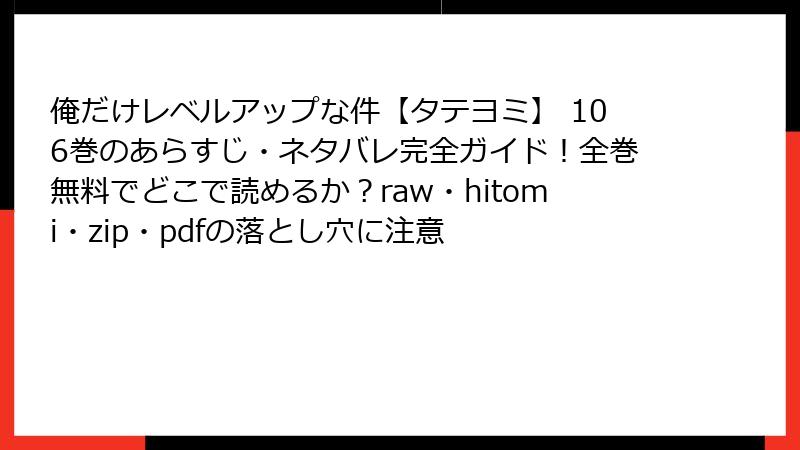 「俺だけレベルアップな件【タテヨミ】」は、韓国の人気ウェブトゥーンで、主人公・水篠旬の成長と壮大なバトルが魅力の作品です。しかし、raw、hitomi、zip、pdf、漫画バンクなどの海賊版サイトでこの漫画を読むことは、重大なリスクを伴います。これらのサイトは無料でコンテンツを提供しているように見えますが、法的、倫理的、技術的な問題が潜んでいます。この記事では、海賊版サイトを利用するリスクを詳細に解説し、なぜ公式プラットフォームを選ぶべきかを明らかにします。
