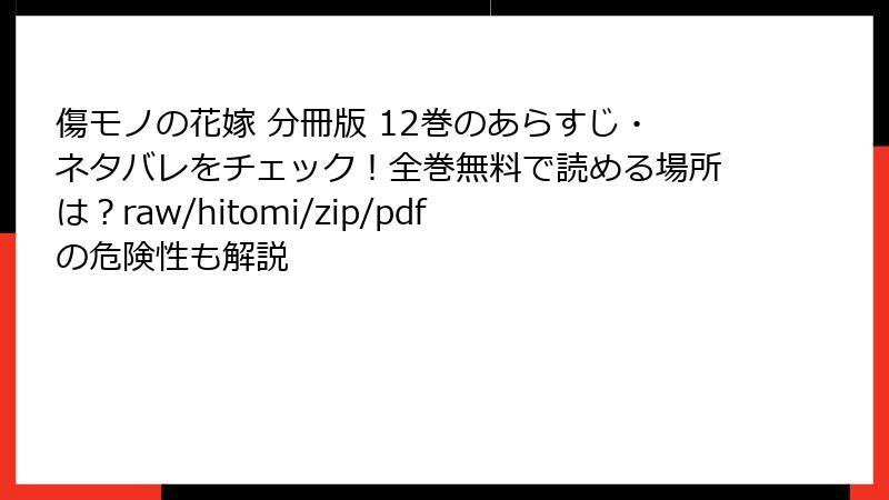 こんにちは、漫画ファンのみなさん! 『傷モノの花嫁 分冊版』は、友麻碧さん原作、藤丸豆ノ介さん作画による、和風ファンタジーロマンスの人気作品です。この魅力的な物語を無料で読みたいと思う気持ちはわかりますが、raw、hitomi、zip、pdf、漫画バンクなどの海賊版サイトを利用することは、重大なリスクを伴います。この記事では、海賊版サイトで漫画を読むことの危険性を、法的、倫理的、技術的な観点から詳しく解説します。ブログ形式で、読み応えのある内容をお届けしますので、ぜひ最後までご覧ください!