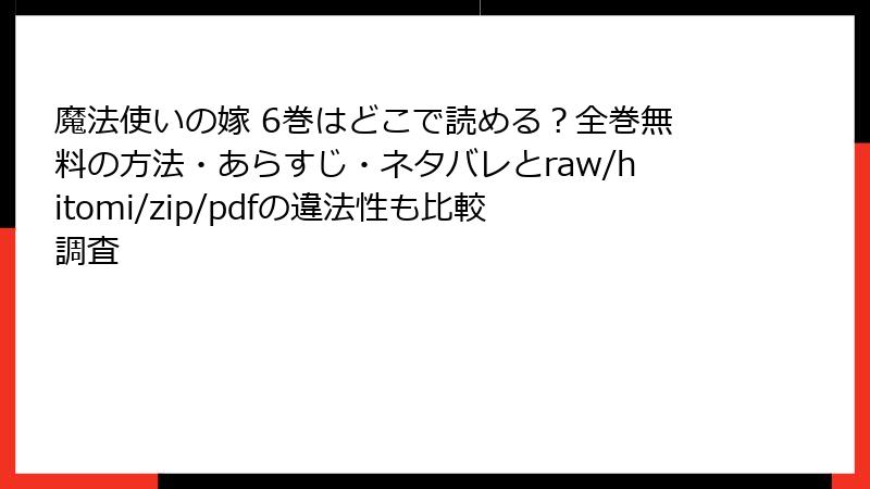 皆さん、こんにちは! 漫画好きのブロガー、セーフマンガです。今日のテーマは、ヤマザキコレ先生の傑作『魔法使いの嫁』のような魅力的な作品を、raw、hitomi、zip、pdf、漫画バンクなどの海賊版サイトで読むことのリスクについて。無料で最新巻にアクセスできるのは魅力的ですが、2025年現在、これらのサイトは法的・セキュリティ・経済的な罠だらけです。利用者の被害事例が急増しており、軽い気持ちで訪れると取り返しのつかない事態に陥る可能性大。この記事では、複数の側面からリスクを詳しく解説し、なぜ正規ルートを選ぶべきかを読み応えのある内容でお届けします。未読の作品を楽しむ前に、ぜひ参考に!