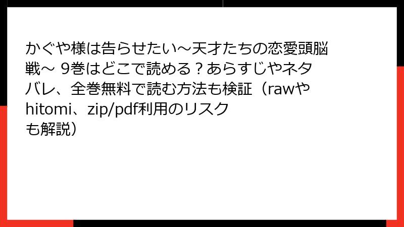 まとめると、海賊版サイトで『かぐや様は告らせたい~天才たちの恋愛頭脳戦~』を読むことは、法的リスク、セキュリティの危険、倫理的問題、品質の低下など、多くのデメリットを伴います。漫画家や業界を支えるためにも、公式プラットフォームを利用することが重要です。安全で高品質な読書体験を楽しみながら、好きな作品を正当にサポートしましょう。MANGA PlusやShonen Jump+などのサービスを活用すれば、クリエイターへの敬意を示しつつ、安心して物語に没頭できます!