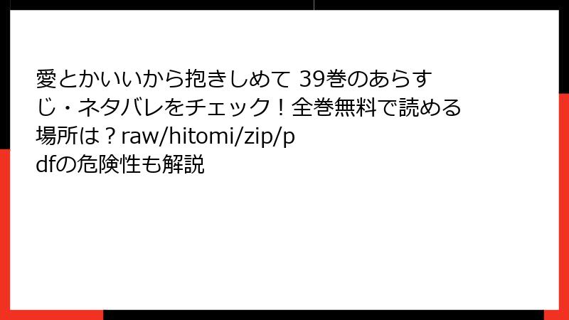 こんにちは、漫画ファンの皆さん! 鳴海涼先生の『愛とかいいから抱きしめて』は、切ない大人の恋愛を描いた大人気作品で、39巻ともなると物語はクライマックスに突入! そんな熱い展開を今すぐ読みたいと思う気持ち、めっちゃ分かります。でも、ちょっと待って! raw、hitomi、漫画バンクなどの海賊版サイトで読むのは、実はめちゃくちゃ危険なんです。この記事では、海賊版サイトを利用して『愛とかいいから抱きしめて』を読むことのリスクを、徹底的に解説します。ブログ形式で、読み応えのある内容にまとめましたので、ぜひ最後までチェックしてください!