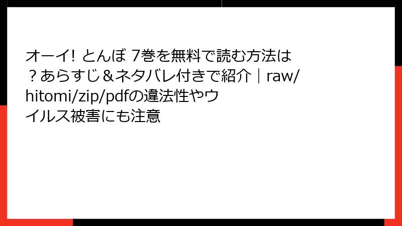 海賊版サイトで「オーイ! とんぼ」を読むことは、著作権法に違反する行為です。日本では、2020年と2021年に著作権法が改正され、漫画の無断アップロードやダウンロードに対する取り締まりが強化されました。以下は、具体的な法的リスクです。