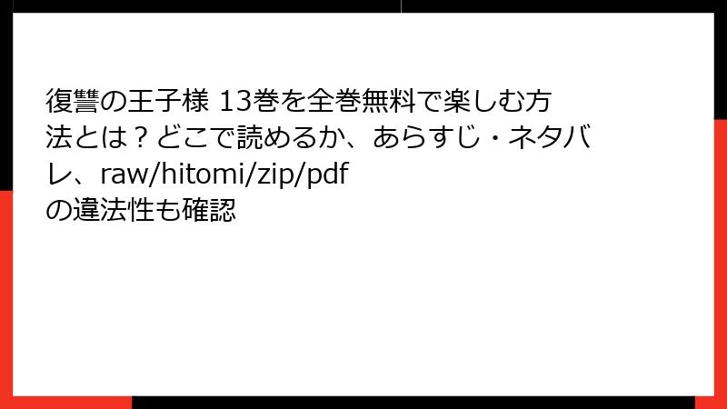 こんにちは、漫画愛好家のあかりです! 『復讐の王子様』は、狸谷ぽんさん原作のダークで魅力的な復讐ストーリーが話題の漫画ですが、残念ながら、raw、hitomi、zip、pdf、漫画バンクなどの海賊版サイトで無料で読もうとする人もいるようです。しかし、これらのサイトを利用することは、法的、倫理的、そして技術的な観点から多くのリスクを伴います。この記事では、『復讐の王子様』を海賊版サイトで読むことの危険性を、複数の視点から詳しく解説します。読み応えのある内容を