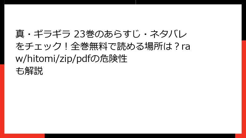 『真・ギラギラ』は、滝直毅原作、岩田和久作画による人気のホスト業界を舞台にした漫画で、熱い人間ドラマと華やかな世界観が魅力です。しかし、このような人気作品を、raw、hitomi、zip、pdf、漫画バンクなどの海賊版サイトで読むことは、重大なリスクを伴います。海賊版サイトは無料で漫画を提供しているように見えますが、利用者にとって法的、倫理的、技術的な危険が潜んでいます。この記事では、『真・ギラギラ』を海賊版サイトで読むことの具体的なリスクを詳細に解説し、なぜ公式プラットフォームを利用すべきかを説明します。以下、ブログ記事形式で、複数の観点からリスクを掘り下げます。