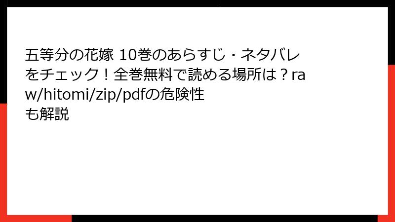 こんにちは、漫画好きの皆さん! 人気のラブコメ『五等分の花嫁』のような作品を無料で手に入れたい衝動、わかります。でも、raw、hitomi、zip、pdf、漫画バンクなどの海賊版サイトに手を出すのは、想像以上のリスクを伴います。2025年現在、これらのサイトは違法アップロードの温床ですが、法的罰則からセキュリティの脅威、倫理的問題まで、利用者の被害事例が急増中。このブログ記事では、そんな闇の側面を多角的に掘り下げます。ネタバレなしで読み進めつつ、安全な楽しみ方を一緒に考えましょう!