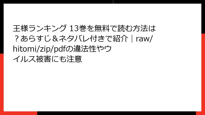 大人気漫画『王様ランキング』。ボッジの勇気あふれる物語に心を奪われ、すぐに続きが読みたくなる気持ち、よくわかります。でも、rawやhitomi、zip/pdf形式のダウンロードサイト、漫画バンクなどの海賊版サイトで手軽に読もうとすると、想像以上の落とし穴が待っています。この記事では、そんな海賊版サイト利用のリスクを徹底的に掘り下げます。法的問題からセキュリティの脅威、さらには倫理的な影響まで、ブログ形式で詳しく解説。まだ利用を検討中の方は、ぜひ最後まで読んで正しい選択を! 安全に楽しむためのヒントも最後にまとめますよ。