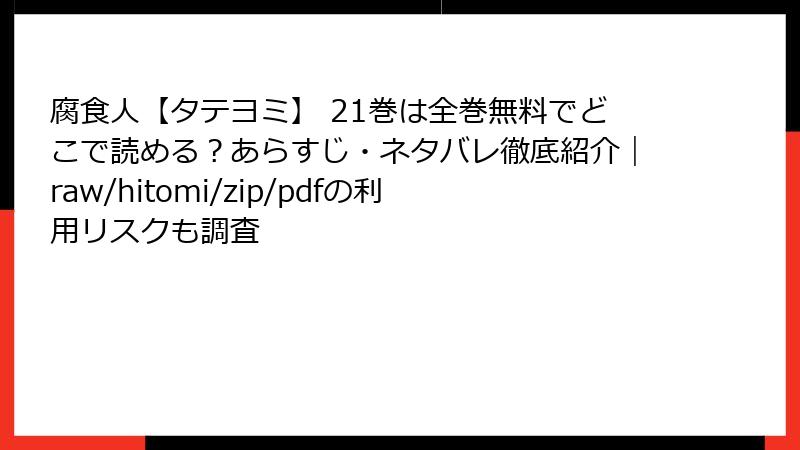こんにちは、マンガを安全に楽しむためのガイドブロガーです! Aeju先生の人気ダークBL作品『腐食人【タテヨミ】』は、終末世界のサバイバルと複雑な人間関係が魅力の傑作ですよね。最新21巻の衝撃展開にハマっている方も多いはず。でも、「raw」「hitomi」「zip」「pdf」「漫画バンク」などの海賊版サイトで無料で読もうとするのは、絶対に避けましょう。2025年現在、これらのサイトは法的・セキュリティ・経済的なリスクが満載で、利用者の被害事例が急増中です。このブログでは、そんな海賊版サイトの闇を徹底解剖。読み応えのある内容で、なぜ正規ルートを選ぶべきかを詳しく解説します。ネタバレなしで、マンガ愛を損なわない安全な読み方を一緒に考えましょう!