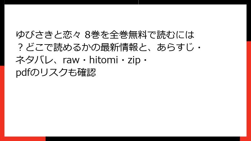 rawやhitomiなどの海賊版サイトは、法的・セキュリティ・プライバシー・倫理の四重苦。『ゆびさきと恋々』のような美しい物語を、心置きなく楽しむなら、正規の電子書籍サービス(例: Kindle、マンガワン)を選びましょう。初回無料キャンペーンも充実しており、リスクゼロで満足度が高いです。皆さんの体験談やアドバイスも、コメントでシェアしてください! 次回は、合法サービスのオススメレビューをお届けします。それでは、安心のマンガライフを。
