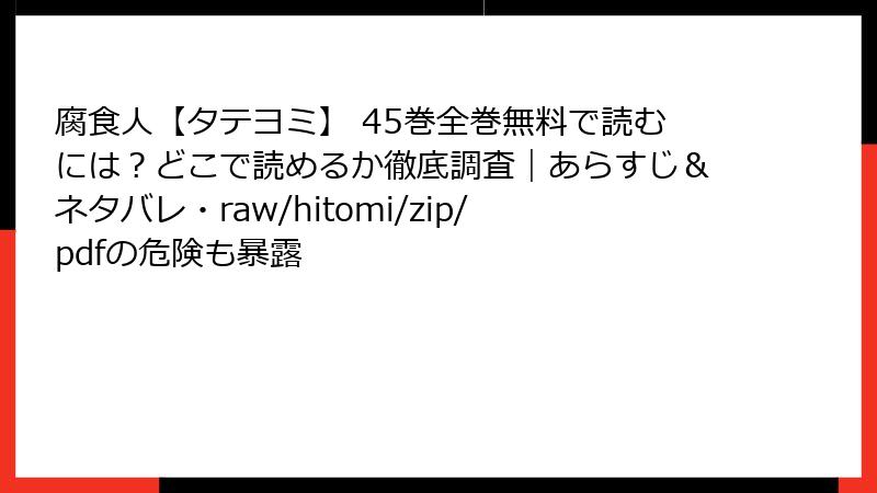 『腐食人【タテヨミ】』の45巻は、フミヤとゲンの絆、レンの覚醒、そして終末世界の過酷なサバイバルが描かれた傑作です。この感動を最大限に味わうためには、海賊版サイトの誘惑を断ち切り、正規のプラットフォームを選ぶことが不可欠。法的リスク、セキュリティの危険、業界へのダメージ、そして倫理的問題を考慮すれば、海賊版の利用がどれほどリスクの高い選択かがわかります。aeju先生の努力をリスペクトし、マンガ業界の未来を支えるためにも、ぜひ正規ルートで『腐食人』を楽しんでください!
