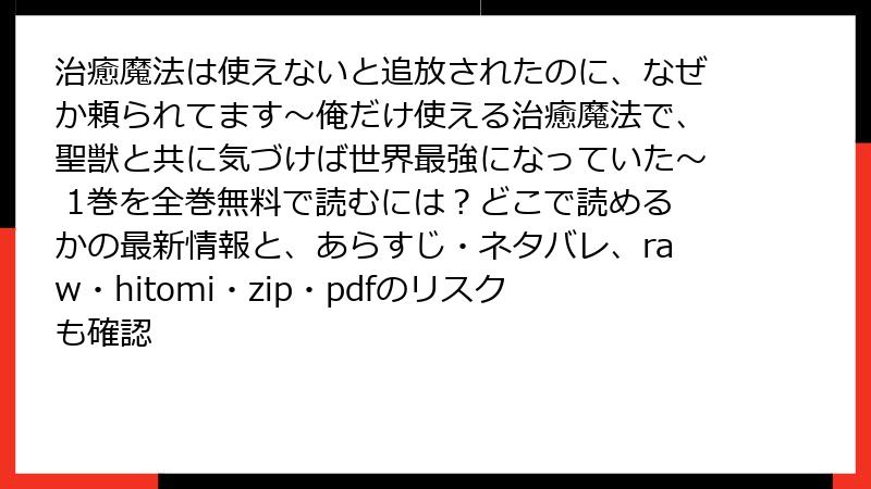 『治癒魔法は使えないと追放されたのに、なぜか頼られてます~俺だけ使える治癒魔法で、聖獣と共に気づけば世界最強になっていた~』は、異世界ファンタジー漫画の中でも「追放もの」として人気を博しています。1巻は主人公の逆転劇と魅力的なキャラ設定が話題で、読者から多くのレビューや口コミが寄せられています。本記事では、2025年10月時点の評判を基に、作品の魅力や読者の反応を詳しくまとめます。以下、ポジティブな評価、批判的な意見、総合的な人気傾向を解説します。