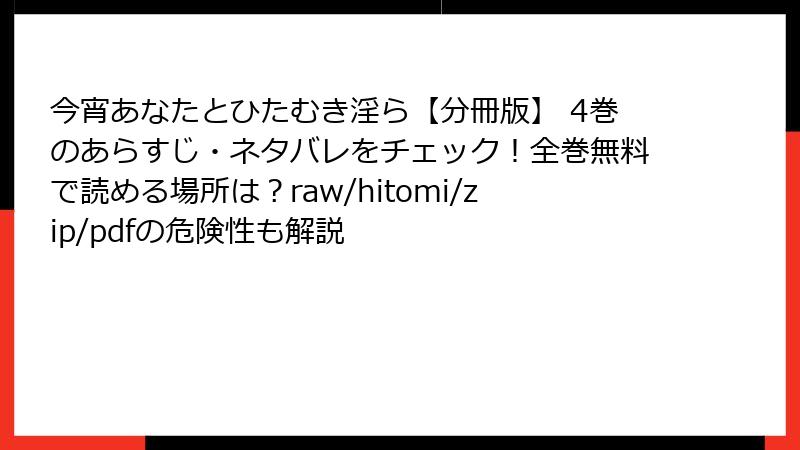 こんにちは、TL漫画ファンでセキュリティ意識高めのブロガーのみゆきです! 今日は、皆さんが気になりがちなトピックに切り込んでいきます。人気作『今宵あなたとひたむき淫ら【分冊版】』みたいな魅力的な漫画を、raw、hitomi、zip、pdf、漫画バンクなどの海賊版サイトで読むことのリスクについて、ガチで詳しくお話しちゃいます。無料で手に入る誘惑はわかるけど、実際は落とし穴だらけ! 法的トラブルからデバイス破壊まで、怖い話が満載です。