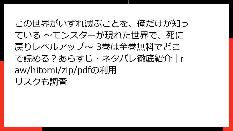 本記事では、「この世界がいずれ滅ぶことを、俺だけが知っている ~モンスターが現れた世界で、死に戻りレベルアップ~」3巻の詳細なネタバレ情報を提供します。このコミックは、死に戻り能力を持つ主人公・一条明がモンスターに脅かされる世界で戦う物語で、3巻では彼の成長と新たな危機が描かれます。以下、物語の核心に迫る展開を章ごとに解説します。ネタバレ全開のため、未読の方はご注意ください。