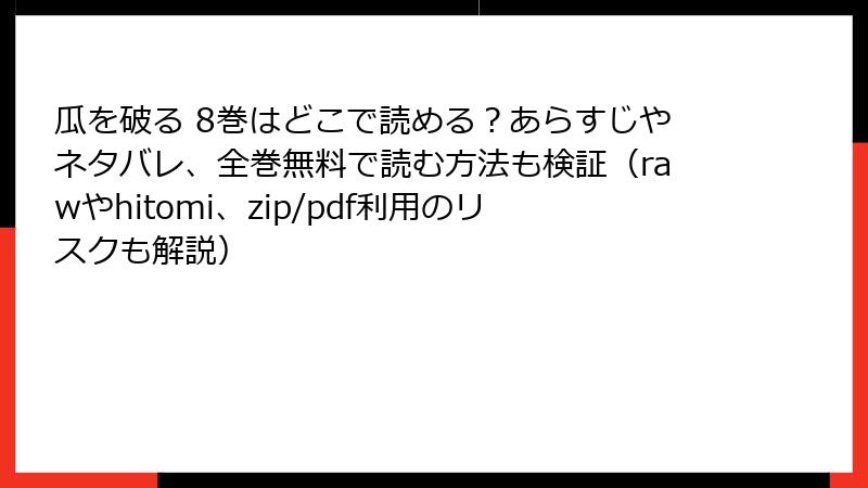 こんにちは、漫画愛好家の皆さん! 板倉梓さんの『瓜を破る』のような、心揺さぶる恋愛ストーリーにハマっている方、きっと多いですよね。最新巻が待ち遠しくて、つい「無料で読みたい!」と検索してしまう気持ち、わかります。でも、raw、hitomi、zip、pdf、漫画バンクなどの海賊版サイトに手を出そうとするのは、危険がいっぱい。2025年現在、これらのサイトはドメインを変えながら生き残っていますが、利用者の被害報告が急増中です。この記事では、そんなサイトのリスクを法的・セキュリティ・倫理・経済の観点から詳しく掘り下げます。ネタバレなしで安全に楽しむためのヒントもお届け。読了後には、正規ルートを選ぶ決意が固まるはずですよ!