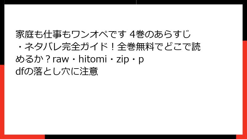 ごとに分解して読み応え満点でお届け。家事・育児の負担が「ワンオペ」状態の過酷さを、リストやテーブルで整理しながら振り返ります。まだ読んでいない方は、ネタバレ注意でお願いします! それでは、さっそく本編の世界に飛び込みましょう。 4巻の全体像:復帰後の日常が限界を迎える
