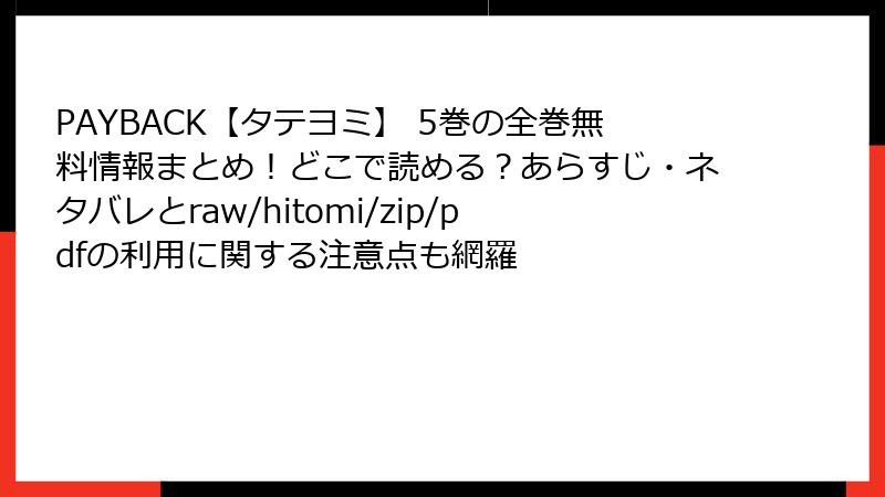 そんなリスクを避けるなら、合法サービス一択! ピッコマやLINEマンガ、ebookjapanなどの電子書籍で、無料試し読みやセールが充実。初回クーポンで『PAYBACK』5巻が数百円で読めちゃいます。セキュリティソフト(例: あんしんセキュリティ)を導入し、怪しいポップアップは無視。万一アクセスしてしまったら、即スキャン&パスワード変更を。