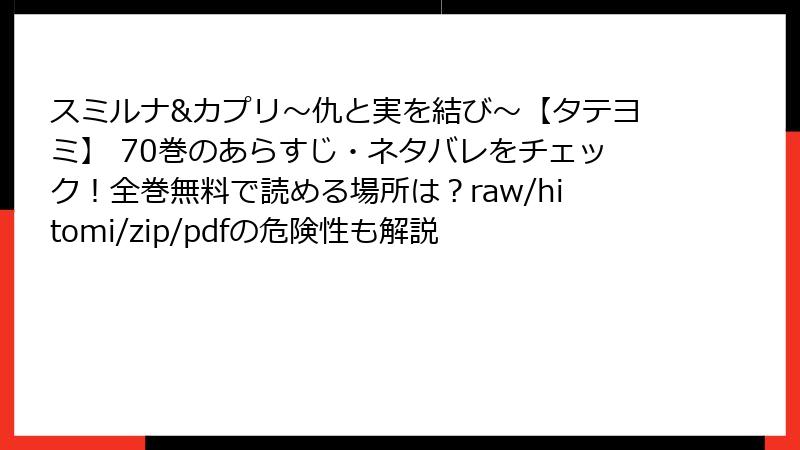 こんにちは、漫画好きの皆さん! 今日の記事では、誰もが一度は検索したことのあるraw、hitomi、zip、pdf、漫画バンクなどの海賊版サイトで『スミルナ&カプリ~仇と実を結び~【タテヨミ】』のような人気BL漫画を読むことのリスクを、徹底的に掘り下げます。2025年10月現在、これらのサイトはドメインを巧みに変えながら存続していますが、一見の便利さの裏側に、法的制裁、セキュリティの脅威、倫理的ジレンマが潜んでいます。無料で最新巻を楽しみたい誘惑はわかりますが、軽い気持ちでアクセスすると、後悔の連続になる可能性大。この記事では、複数の視点からリスクを詳しく解説し、安全な代替策も提案。読み終わったら、正規ルートを選ぶきっかけになるはずです!
