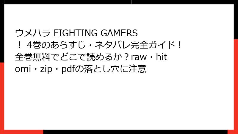 『ウメハラ FIGHTING GAMERS!』を海賊版サイトで読むことは、法的トラブル、デバイスや個人情報の危険、作者や業界へのダメージ、そして粗悪な読書体験という四重のリスクを背負う行為です。格闘ゲームの頂点を目指すウメハラの物語は、フェアな精神と情熱がテーマ。それを尊重するなら、正規の購入を通じて作品を応援するのが真のファンというもの。書店や電子書籍プラットフォームで4巻を手に取り、ゲーセンの熱気を安全かつ最高の品質で感じましょう。違法サイトの誘惑に負けず、ウメハラのように「正々堂々」と向き合いたいですね!