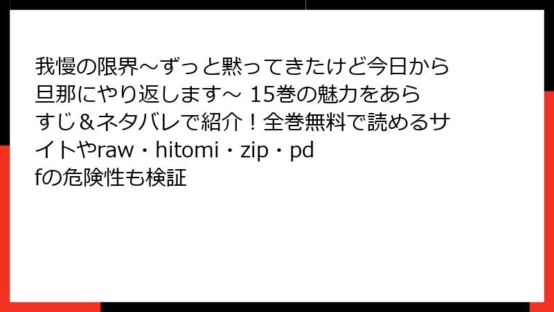 こんにちは、マンガ愛好家の皆さん! 青梨先生の『我慢の限界~ずっと黙ってきたけど今日から旦那にやり返します~』15巻が、読者の間で大きな話題を呼んでいます。このコミックは、モラハラ夫への主人公・美菜保の反撃を描いたリアルな人間ドラマで、15巻では物語がクライマックスに突入。ネットやSNSでのレビュー、口コミ、評判を基に、この巻の魅力と読者の反応をブログ形式で詳しく掘り下げます。ネタバレは控えめに、感想の多様性を