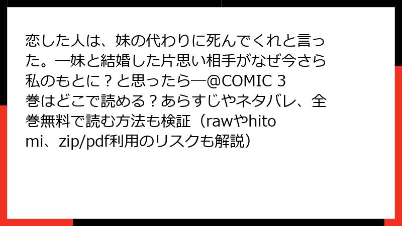 人気のファンタジーラブストーリー『恋した人は、妹の代わりに死んでくれと言った。―妹と結婚した片思い相手がなぜ今さら私のもとに?と思ったら―@COMIC』を、無料で手に入れたい一心で海賊版サイトに手を出したことはありませんか? 確かに、raw(未翻訳版)、hitomi(主にアダルト寄り)、zip/pdf形式のダウンロードサイト、漫画バンクのような違法プラットフォームは、便利に見えます。でも、実際にはこれらのサイトは「罠だらけの迷宮」。ウイルス感染から法的罰金、個人情報漏洩まで、数えきれないリスクが潜んでいます。この記事では、2025年現在の最新事例を基に、これらの危険性を深掘り。決して軽視できない現実を、ブログ風に詳しく解説します。読後には、正規ルートで楽しむ魅力が再認識できるはずです!