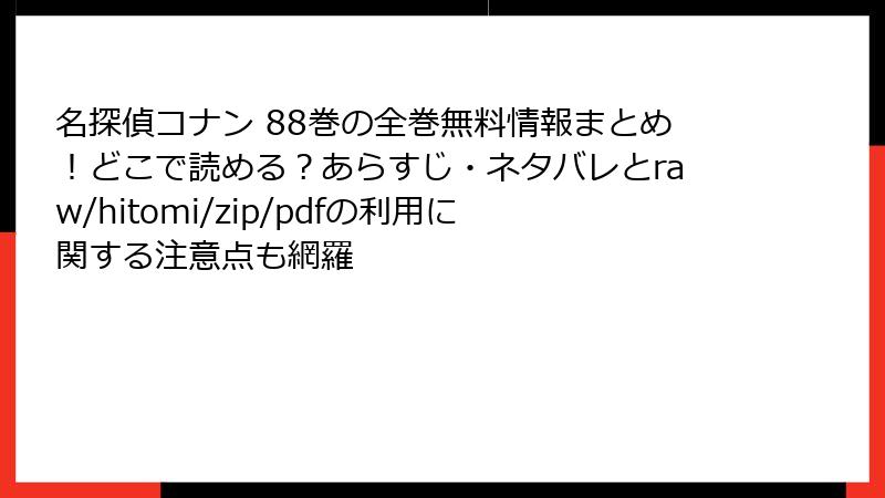 『名探偵コナン』88巻は、推理の深み、キャラの魅力、ホラーの新鮮さが融合した傑作。灰原の知性、世良のミステリー、平次の熱血が織りなす物語は、ファンなら誰もが満足する内容です。レビュー平均4.5点、SNSトレンド常連、考察コミュニティの熱狂ぶりから、88巻の評判は「コナン黄金期の証明」とも言えるレベル。初心者から古参まで楽しめるこの巻、ぜひ正規版で手に取って、その興奮を味わってください!