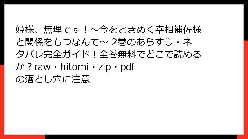 こんにちは、漫画ラブストーリー大好きブログ主です! 今回は、竹輪先生原作、小神よみ子先生の作画による『姫様、無理です!~今をときめく宰相補佐様と関係をもつなんて~』2巻のネタバレを、たっぷりとお届けします。1巻で衝撃の媚薬事件から結婚に至ったフェリとラメルの物語が、2巻ではさらに甘く、切なく、時にスパイシーな展開に! じれったい夫婦のすれ違いと絆の深まりを、ネタバレ全開で詳しく解説します。以下、ストーリーの核心に迫る内容なので、未読の方はご注意を! 各章のハイライトやキャラクターの動きを、
