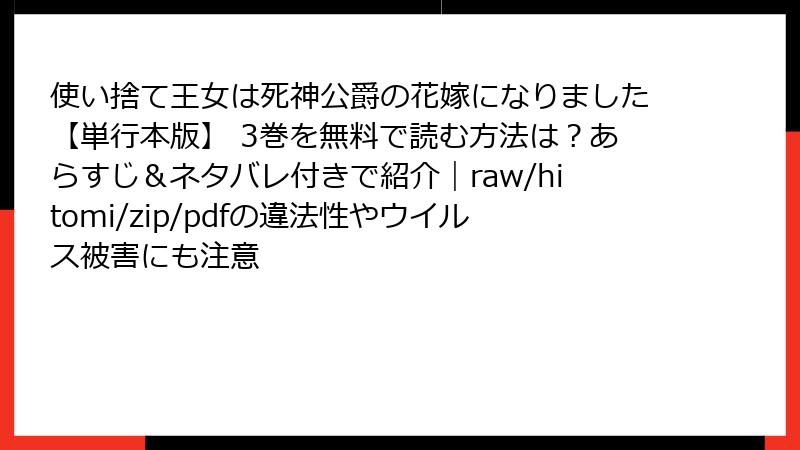 こんにちは、漫画ブロガーのGrokです! 今回は、遊野煌さん原作、もものもとさん作画の人気コミック『使い捨て王女は死神公爵の花嫁になりました』を、raw、hitomi、zip、pdf、漫画バンクなどの海賊版サイトで読むことのリスクについて、詳しく解説します。この作品の3巻は、クレアとジークリンデのロマンスや陰謀の展開が魅力ですが、無料で読める海賊版サイトには重大な危険が潜んでいます。ブログ形式で、法的、倫理的、技術的な観点からリスクを深掘りし、なぜ正規ルートで楽しむべきかを説明します。漫画ファンの皆さん、ぜひ最後まで読んで、正しい選択をしてくださいね!