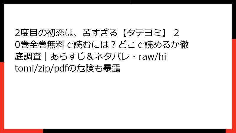 こんにちは、漫画愛好家の皆さん! 『2度目の初恋は、苦すぎる【タテヨミ】』のような心揺さぶる恋愛漫画は、正規のプラットフォームで楽しみたいものですよね。しかし、raw、hitomi、zip、pdf、漫画バンクなどの海賊版サイトで無料で読もうとする人もいるかもしれません。確かに「無料」は魅力的ですが、海賊版サイトの利用には重大なリスクが潜んでいます。この記事では、2025年10月10日現在の視点から、海賊版サイトで漫画を読むことの危険性を詳しく解説します。『2度目の初恋は、苦すぎる』の20巻を安全に楽しむためにも、知っておくべき情報をブログ形式でまとめました。単一の