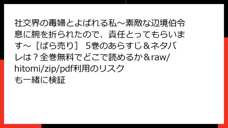 こんにちは、マンガ好きのブロガーです! 今日は、ちょっとデリケートな話題ですが、『社交界の毒婦とよばれる私~素敵な辺境伯令息に腕を折られたので、責任とってもらいます~』のような人気コミックを、海賊版サイト(raw、hitomi、zip、pdf、漫画バンクなど)で読むことのリスクについて詳しくお話しします。無料で読めるのは魅力的ですが、実は法的・セキュリティ・倫理的な落とし穴がいっぱい。2025年現在、取り締まりが強化され、被害報告も増えています。この記事では、ブログ形式で複数の角度からリスクを深掘り。ネタバレなしで、読み応えのある内容にまとめました。海賊版は避けて、正規ルートで楽しむのがおすすめですよ!