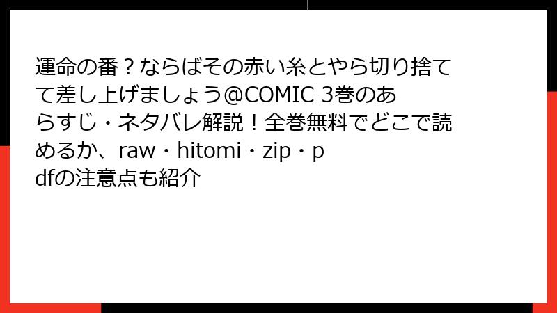 こんにちは、漫画好きの皆さん! 今日は、ちょっとデリケートなトピックですが、運命の番?ならばその赤い糸とやら切り捨てて差し上げましょう@COMICのような人気作品を、raw、hitomi、zip、pdf、漫画バンクなどの海賊版サイトで読むことのリスクについて、詳しくお話しします。無料で手軽に読める魅力はわかりますが、実際には法的・セキュリティ・倫理的な落とし穴が満載。ブログ形式で、複数の角度から読み応えある解説をお届けします。未読の作品を楽しむなら、正規ルートをおすすめしますが、まずはこれらのリスクを知って賢く回避しましょう!